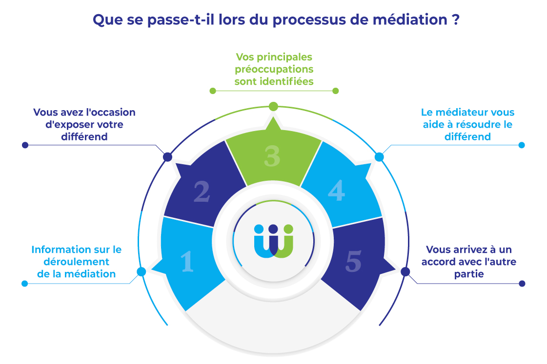 La médiation est un dispositif par lequel des parties conviennent de demander à un tiers, le médiateur, de les accompagner dans la recherche d’une solution à leur conflit. La médiation est souple et flexible, les parties y conservent le plein contrôle du déroulement. Le médiateur est là pour rapprocher les points de vue des parties et leur proposer des solutions fiables, et ce dans un cadre privé et confidentiel.
